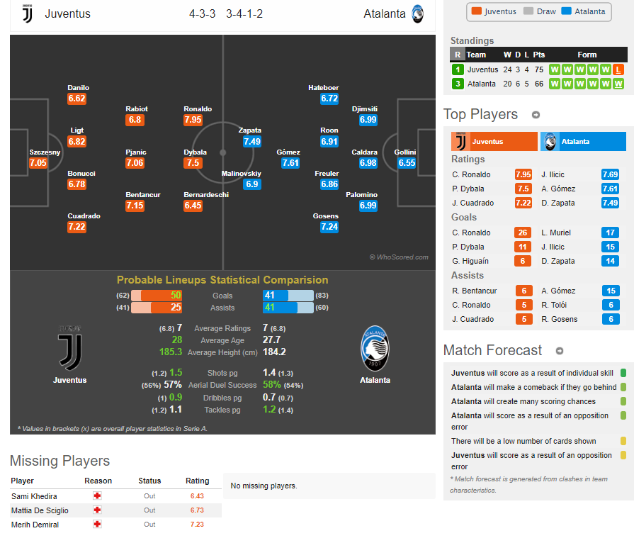 Uma das partidas mais esperadas do campeonato promete um show de futebol. De um lado com a melhor defesa do campeonato a Juventus vem de uma derrota esmagadora para o recém recuperado Milan. Mesmo assim, para as casas a Juve vem como grande favorita para esta partida. Chega com 3 desfalques e são eles o Sami Kedira, o Mattia De Sciglio e o Merih Demiral, enquanto a Atalanta vem completa.