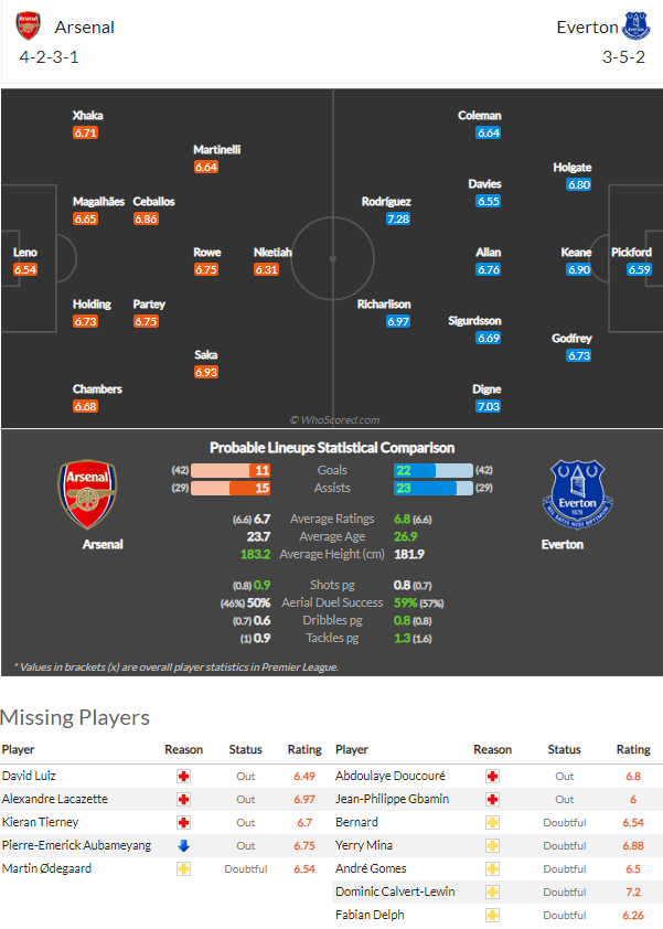 Everton, time que vem de uma sequência horrível de 6 jogos sem vencer irá visitar o Arsenal para tentar somar pontos no jogo dessa tarde. O Time do Everton mão contará com Doucoure e Gbamin para o jogo de logo mais, entretanto, o Calvert-Lewin e Bernard estarão disponíveis sendo o primeiro titular.
